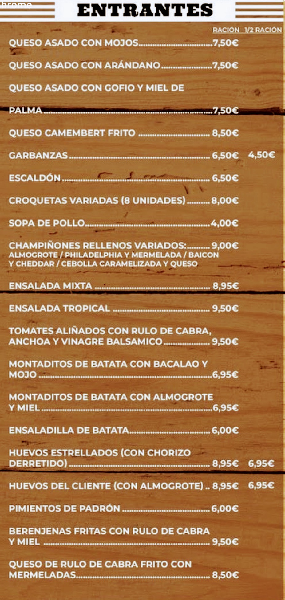 Aquí está La Carta del Bar Restaurante Guayadeque Menú Comida Canaria Queso Semiduro. 3,40 € Queso Frito. 5,20 € Jamón Serrano. 3,80 € Aceitunas. 1,80 € Pimientos de Padrón. 4,40 € Papas Arrugadas con Mojo Rojo 3,40 € Ensalada Mixta. 5,60 € Gambas al Ajillo. 6,10 € Carne de Cerdo Frita. 4,80 € Tacos de Pescado 6,50 € Chipirones Fritos 7,50 € Chocos Fritos. 7,50 € Croquetas Caseras de Pescado 4,40 € Pechuga Empanada 5,90 € Escalope de Ternera 6,10 € Vueltas a la Casera. 8,50 € Vueltas de Ternera a la Plancha. 6,90 € Pechuga a la Plancha. 5,90 € Cinta de Lomo a la Plancha. 5,90 € Calamares Fritos. 14,50 € Puntillas de Chipirones. 7,00 € Tomate Aliñado. 3,90 € Tortilla Española. 4,40 € Ropa Vieja. 4,60 € A la Parrilla (Fines de Semana) Chorizo Parrillero. 2,00 € Morcilla Canaria. 4,00 € Pimiento Asado 1,90 € Alitas de P...